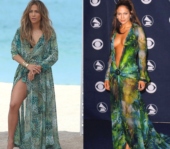 La chanteuse vêtue d’une robe incroyablement sexy et transparente semble s’être inspiré de la robe Versace qu’elle portait en 2000 pour la cérémonie des Gammys Awards. Jennifer Lopez avait joué la carte de la provoc' lors de cet événement et depuis l’organisation des Grammy Awards à interdit des tenues aussi sexy, finis les décolletées jusqu’au nombril, les voiles transparents et les jambes à peine habillées.